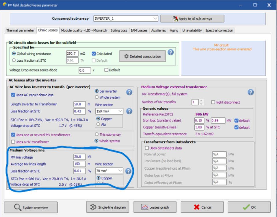 In this example, you have 7 inverters with 9 Mppt inputs and therefore overall 63 strings. The Field global wiring resistance is the whole resistance for all strings and inverters? I would like you to calrify me, if is necessary to create differents subbarays in define system dialog in order to define one by one the lengths of each string and mppt input? Or i can define a value (cable length) for all strings. In our projects we don't use Main so I don't define any value there I keep it equal to 0. Thank you!