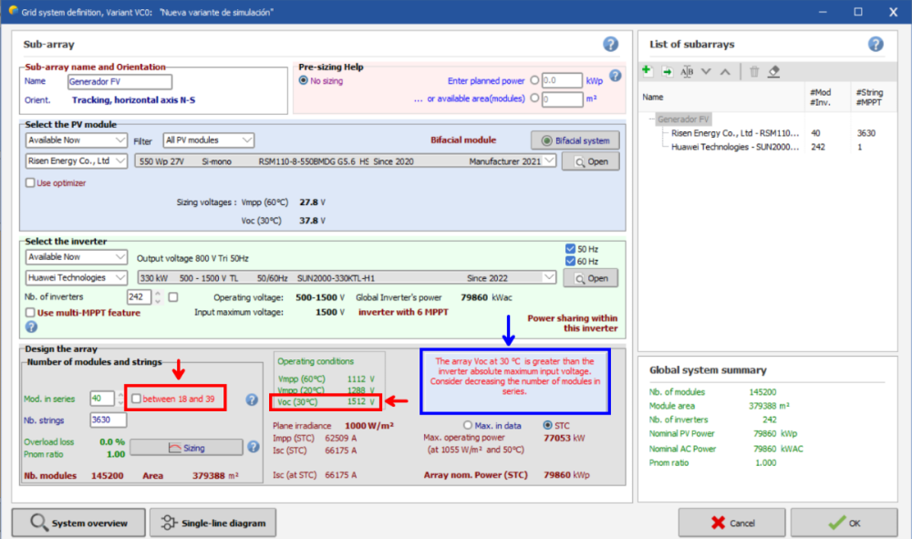 Hi Everybody I have a trouble... A customer that says that through its own simulation software (does not provide information) it can configure strings of 40 modules RISEN brand modules RSM110-8-550BMDG, but in PVSyst it does not allow this, but rather a maximum of 38 modules in series with a minimum temperature of 20°C. The client also says that they consider a minimum temperature during peak production hours of 20°C. Is it possible to configure strings of 40 modules in PVSyst through RISEN brand modules model RSM110-8-550BMDG? The installation location is at the following coordinates: #Latitude: 10.615 / #Longitude: -74.81 I greatly appreciate your support.