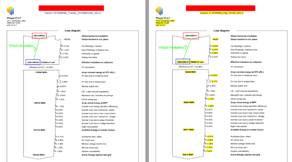 Thank you for the clarification on how to determine a Global PR for the same large-scale photovoltaic system (75MWp installed) with a mix of both fixed and tracker structures. Based on the simulation results (see attached image), specifically the loss diagram, which irradiation should be used in the formula? The GHI or the effective irradiation on the collectors? My questions arise because independently, with the area that has fixed structures (22MWp installed) a PR of 82.85% is obtained with an energy production of 36212.85MWh/year, while with tracker structures (53MWp installed) a PR of 80.84% is achieved with an energy production of 102126.12MWh/year. I greatly appreciate your kind response and cooperation on this matter.