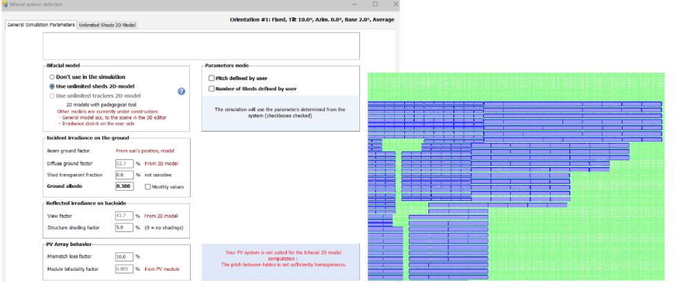 Good day PVSyst team, I'm trying to do a simulation where I have two kind of portrait table : 2V and 3V. At the moment of activate Bifacial model appears the next notice: "Your PV system is not suited the bifacial 2D model computation: The pitch between tables is not sufficently homogeneous". Is it posible fix this problem? Thank you so much.