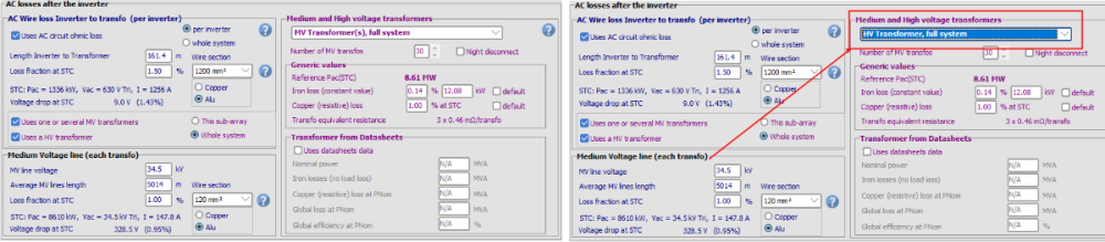 Dear PVsyst Team, I would like to report a potential issue encountered in the simulation software starting from version 8.0.10. Specifically, when selecting between medium-voltage and high-voltage transformers, the configuration panel for the corresponding voltage line does not update accordingly. The section that includes settings such as voltage level, average line length, loss fraction, and conductor cross-section remains frozen or unresponsive, retaining the previous values even after switching the transformer type. This behavior makes it impossible to properly configure or review the parameters related to the selected transformer voltage level. This issue began to occur after updating to version 8.0.10, and it was not present in previous versions. I would appreciate it if you could look into this issue and let me know if there is any workaround or upcoming fix planned. Thank you for your support. Best regards,