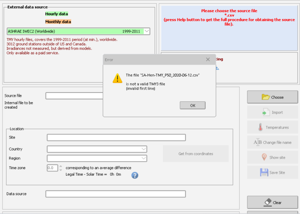 Hello, I am trying to upload TMY3 file to the application but I face an issue as below. I uploaded copy of the file in the below link for you kind review and advice what are the mistakes in the files. https://falghanim.sharefile.com/d-s635388b83bb847968d66bc24acd267f6 Appreciate if you could give a sample of the right TMY file. Thanks.