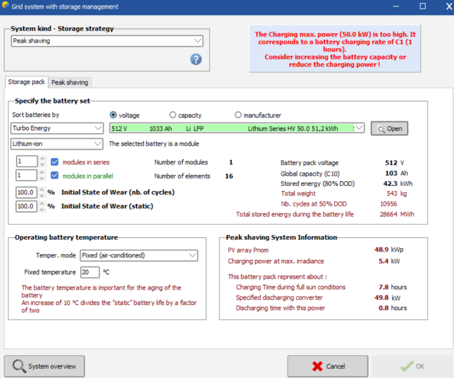 I am trying to simulate a system with a 50 kW inverter and a module of 10 bateries of 512V 103Ah and 51,2 kWh.