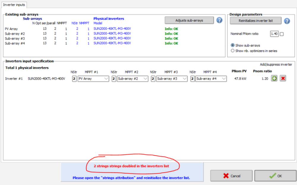 2. Hello, While putting together a Huawei based system I encountered a series of errors related to the use of Huawei optimizers and am currently unable to progress past the system configuration. Below, I will try to explain the process and the individual errors I am encountering. The system is composed of 1 inverter (the Huawei SUN2000-40KTL-M3-400V) split into 4 separate sub-arrays, each consisting of 1 MPPT with 2 strings. Along with the Huawei inverter, Huawei optimizers were selected and distributed across all PV modules, leading to compulsory string configuration which was set up as seen below: This was not immediately possible and I had to manualy close this window and quickly edit the total module number by a few modules more and then back in order to get rid of automated errors claiming the strings were not distributed correctly (unfortunately I was not able to replicate this bug in my latest session). The problem however remains and while the inverter input distributions claims the string / MPPTs are distribute dcorrectly, there is error at the bottom preventing me from continuing further: Following the blue text instructions just leads to the reset of the atribution and after repeating the process I arrive at the exact same error of "2 strings strings doubled in the inverter list". If I press okay and then confirm that I want to keep the changes even with the error present, I get brought back to the system window and something even stranger happens, the total AC power just randomly changes from the expected 40kW of the 40kW inverter to seemingly random value up to 40 (30kW AC in the example below): This persists until the total number of pv modules in any sub-array is changed but this action resets the string configuration of optimizers, requiring me to go through the process again and eventually just leading to the same result (this time the nominal AC power was changed from 40 to 34,7 kW, next time it was 30,4 kW). If I decide to close the system definition menu using the OK button even though the following error is displayed I am not able to proceed further. Furthermore, if I decide to save the project at this point, the whole program crashes. I have sent the bug report via email. Thank you in advance for any replies or answers to this post, I hope this can lead to quick solution of these problems. R. P.