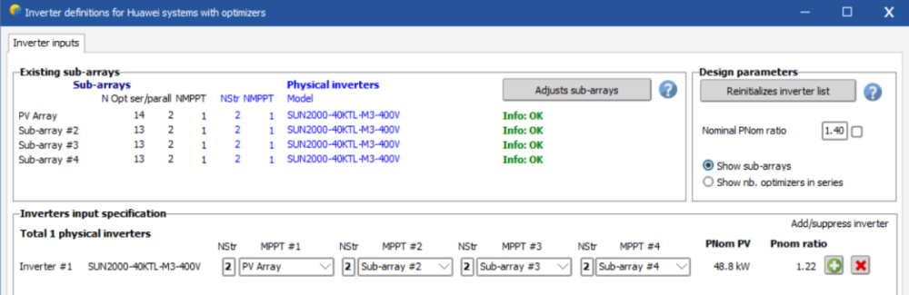 5. Hello. In the most recent version of PVsyst 7.4, the use of Huawei optimizers mandates only connecting a single string to each mppt. This should be correct only for the new model of Huawei optimizers (MERC 1100 and 1300W). The older optimizers (450 and 600W-P) should not have this limitation as they can be (as is explicitly stated in the manufacturer's user manuals) connected to a single MPPT in paralel, meaning two strings with partial or full set of optimizers can be connected to a single mppt (bearing in mind the other important rules that the manufacturer states). I have also tested this the older version of PVsyst (7.3) and the limitation for single string/mppt was correctly not present in that version, only in 7.4. I would like to ask that this problem is looked at and if possible corrected for the SUN2000-450W-P and SUN2000-600W-P optimizers. And if possible, if the newer version of 450W optimizers (P2 instead of P) could be also added to the Huawei optimizer database. Thank you in advance. R. P.