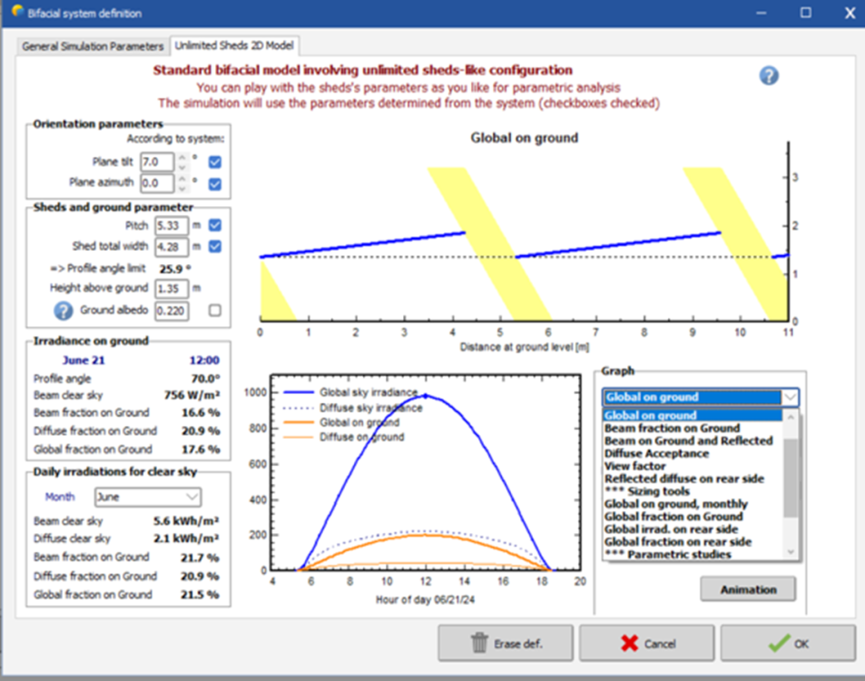 The issue should be related to the values of "global on ground," as shown in the figure below. As you mentioned in your previous response, when the height of the solar modules increases, the reflected sunlight on the ground increases. This means that the value of "global on ground" should increase, right? Then, why, in the figure below, does the value of "global on ground" decrease when the height increases?