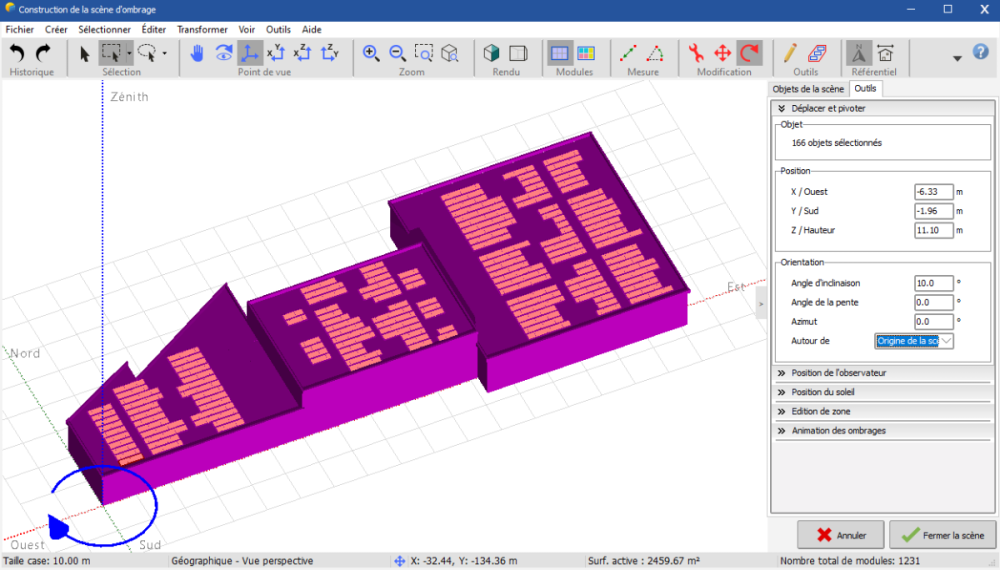 Hello, Before PVSYST 8.0, I used to create all my near shading scenes in the coordinate system X-Y, before rotating them around the scene origin, to get the real azimut of my project. In my opinion, it was easier to move all the componants just with their X and Y positions. But now, PV tables are already oriented according to their azimut and it's now longer and less precise to create near shadings scene. Have you a tips to solve this problem ? thanks