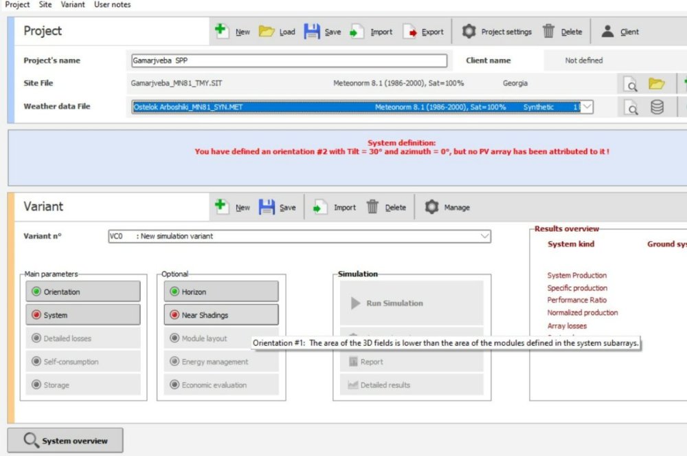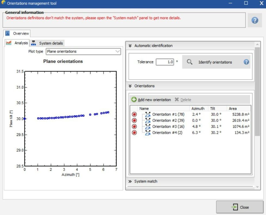 Hello, I imported PVC file from PVdesign successfully. In the "Near shading 3D scene" followed the following fields: "Shading field construction"-"Tools"-"Orientations Management", identified orientations (Result is attached, see file "Screenshot 1") and I received 4 different orientations. "Near shading 3D scene" page shows the following notification - "Orientation #1:"The area of the 3D field is lower than ......" (screen in attached, see file "Screenshot 2). Project first page screen is attached which shows mismatch between "System " and "Near Shading" (See attached file "Screenshot 3"). Can you please tell how to proceed? In forum page is written "After creating the orientations in the 3D scene (8 at most), you will have to harmonize them with those defined in the system and assign the subfields to these orientations", this may be the way but I can not find out how the subfields should be assigned to these orientation?