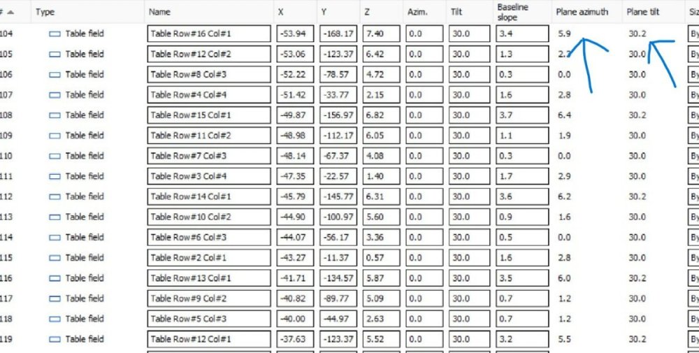 Thank you for prompt reply. The box which I want to change is not editable, I click but is has no affect. Please see the attached file "Screenshot_1" where I indicated with arrow the field which I want to modify (Nominal-real tilt and azimuth). Nominal tilt and nominal azimuth has modification function, but I want the nominal tilt and nominal azimuth to be equal to real tilt and azimuth, That is why I want to change real tilt and azimuth. For example table filed #104 has plane azimuth 5.9 which has to be 0 and plane tilt is 30.2 which has to be 30.0. Thank you -
