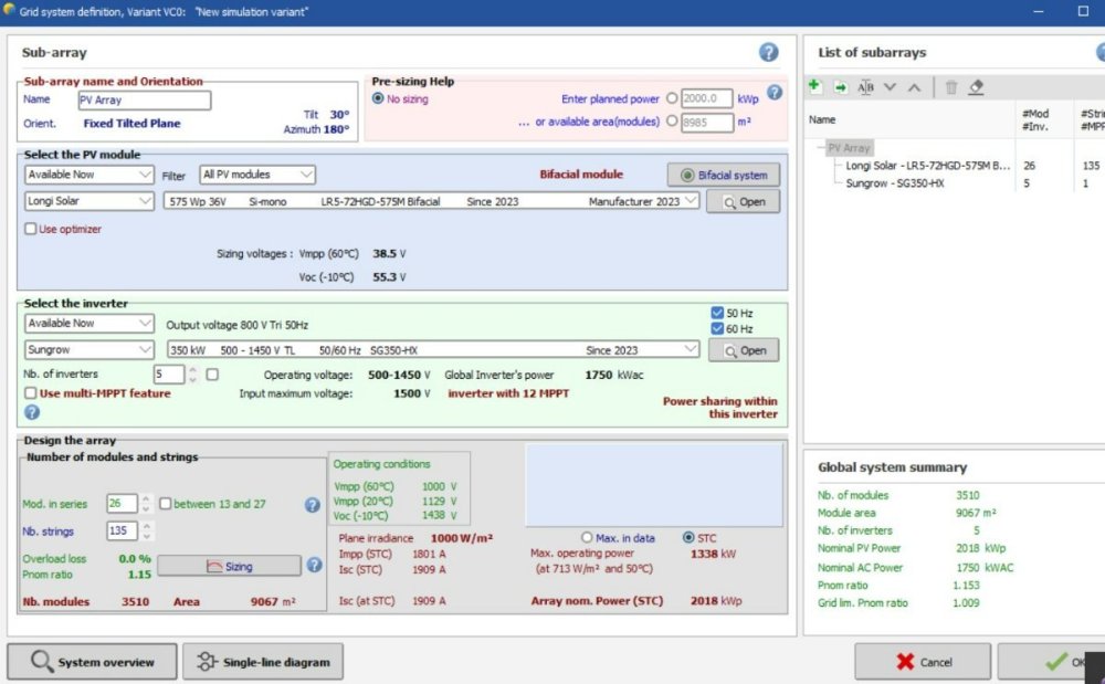 I am using the SUN2000-115KTL-M2 inverter, which has the following specifications: Maximum AC Power: 125 kVA (at cosφ = 1) Nominal AC Power: 115 kVA I plan to configure the inverter to operate at its maximum AC power of 125 kVA. However, I noticed that PVsyst uses the nominal power (115 kVA) for its calculations. Could you please advise how I can reflect the maximum power configuration (125 kVA) in PVsyst to ensure accurate generation calculations?