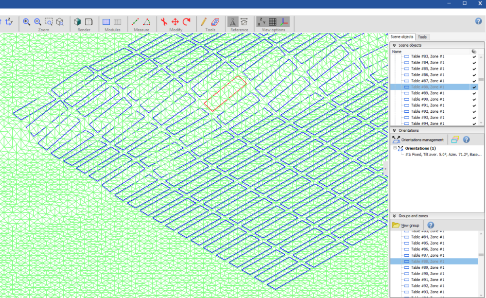 Hello, If you’d like to fill an area on a hill with PV modules, you can use the Zone Editing Tool. Once you've defined the zone using either a rectangular or polygonal area, click on Field Properties and set the desired tilt and azimuth (select Uses average), then click on Fill Zone. Here’s an example of how a filled zone appears on hilly terrain: After filling the zone, you can select and edit an individual table (like the one highlighted in the scene above). You’ll notice that the baseline slope is automatically taken into account. The Basic Parameters of the selected table will also show the actual tilt and azimuth values for that specific table: Hoping this helps you. -