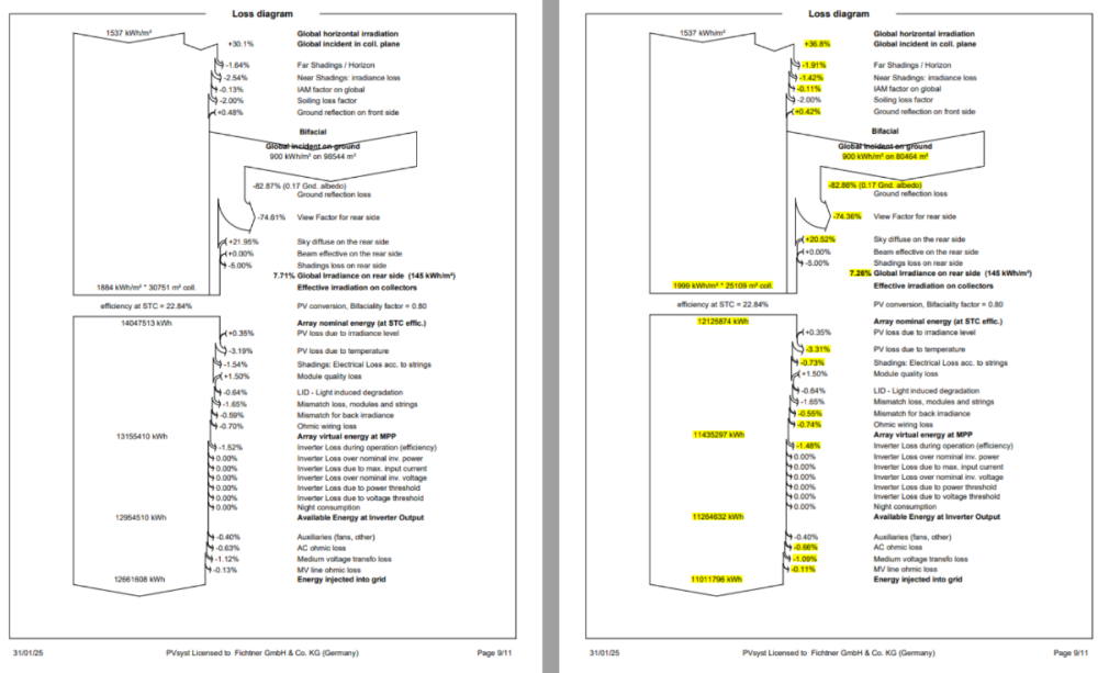 Hi everyone, for two neighboring projects having the same meteo data as well as same tracker configuration in terms of width and length of the tables, I get very different specific production in the order of 120 kWh/kWp. Looking at the loss diagrams of the two simulations, I noticed that the difference mainly relies upon the imported 3D scene (.pvc), as the one with lower production features a more undulating topography. Therefore, as far as I understood, it is reasonable to have higher losses such as Near shadings and shading losses according to strings for the project with challenging terrain. However, I was also noticing that the parameter Global Incindent in collec. plane is quite different, with the project with more challenging topography having a gain 6% less than the other. Such divergence can be justified by the different 3D scene? Considering all these aspects and seeing the below loss diagrams, do you think that for two close projects, such deviation in production can be linked to the 3D scene, meaning the underneath topography? I hope you can help me with those questions, and I'm available for further discussions. Best regards.