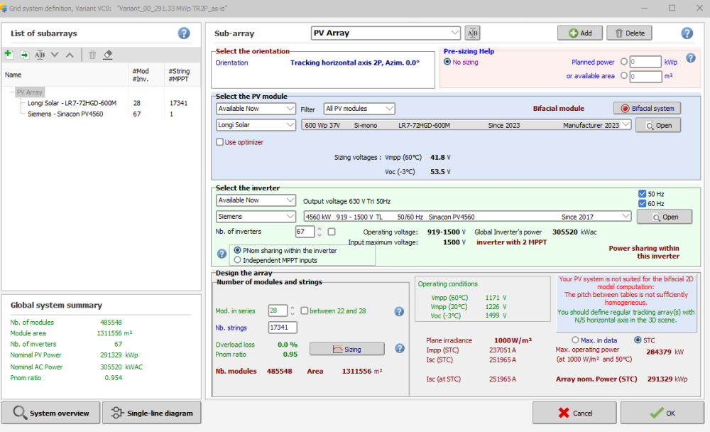 Hi All, I am currently using PVsyst version 8.0.9 and in the 3D scene, I am trying to export a .pvc file created with PVcase in which there are two different pitch values. While activating the bifacial features, I encounter an issue that does not allow to compute the simulation since the pitch is not sufficiently homogeneous. With PVsyst 8.0 is there a way to simulate in the same variant bifacial system with different pitch values? Am I trying to get the simulation in one single variant and not in two variants (one with a pitch of 9m and the other with pitch of 12m) and do the post-calculation. The reason is that I am trying to identify the impact of shadow casting of wind turbinesand those wind turbines are near trackers with both 9m pitch and 12 m pitch. Below, there is a screenshot of the problem. Any help is really appreciated. Best regards, Vinh