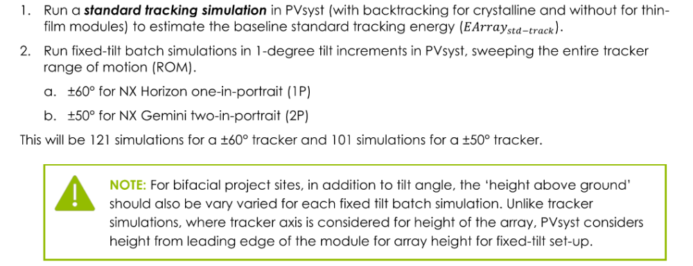 Ah, thank you. Perhaps I should share my intended goal. I am trying to follow the below procedure. However, it is difficult since a "tracker" Near Shading scene cannot be changed to a "fixed tilt" so I have to re-create it, it seems. Similarly, while a tracker rotates about it's center point, a fixed tilt is modeled in PVsyst from its edge and will only permit me to swing it around from 0 degrees to 90. Do you have any advice for the most efficient way to follow these steps? -