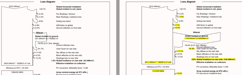 Hello - We have a simulation with imported topography. To try and minimize the transposition averaging error we created a second variant that groups the tracker tables into two separate orientations, one from 8.7 deg to 1.4 deg axis tilt, and one from 1.3 deg to -6.1 deg axis tilt. Two orientations were made and each has its own subarray. The final energy result of the variant with two orientations seems unaccountably low compared to the original. The right waterfall is the original, single orientation model. The one on the left is the new, two orientation version described above. I do not understand why the Effective irradiance on collectors to Array nominal energy changed by a much greater percentage (~3.5%) than the corresponding Effective irradiation values (0.4%). The 9 and 57 inverter groupings belong to Orientation 2 while the 2 and 26 inverter groups belong to Orientation 1. I initially noticed an error in how the strings were split between inverters in the sub-arrays but even after correcting this the above behavior persisted. Thank you