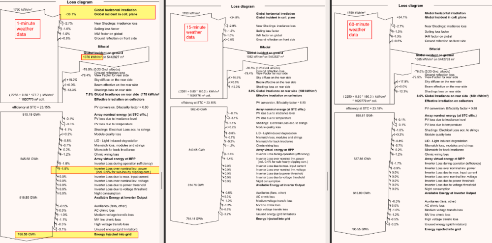Hello - I recently ran a test on the same variant using 60-minute, 15-minute, and 1-minute TGY (typical GHI year) data from a satellite weather provider. The 15-minute Egrid was less than 60-minute (due to sub-hourly clipping), but (surprisingly) the 1-minute result was the highest out of the three. This was due to higher Global Incident in coll. plane (POA, plane of array). The top line GHI varied by one - due to rounding differences per the satellite provider explanation. I'm hoping to better understand why the pvsyst simulation would have had this result. I reviewed the PhiAng and the hourly tracking angles are identical. See image below of the three different weather file runs' waterfalls. Thank you 1min, 15min, 60min pdf.pdf
