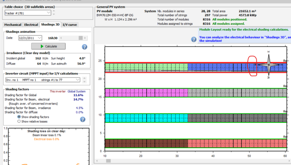 10. Hi PVSyst Team, Since my scene is too large, I created a smaller scene exactly for 1 central inverter. Base from the module layout I have this values. QUESTIONS: 1. Following the guide from PVSyst Help screenshot above then = 29.4% - 9.3% = 20.1% (Is this the fraction for electrical effect that I will be using in the Nearshading ?) 2. I also did a 100% Fraction for electrical effect but I'm not sure about the definition of "regular (row-to-row)". can you further explain this? By the way my scene have only tracker tables without trees or other shading. The terrain comes from PVCase. and this is the result.