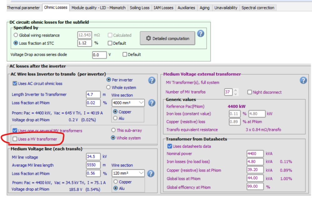 4. Hi Linda, There's already a PVSyst file with all inputs are present. The request is to generate another report to have HV losses excluded. Is unticking this box the correct way to exclude the HV losses? (see image below)