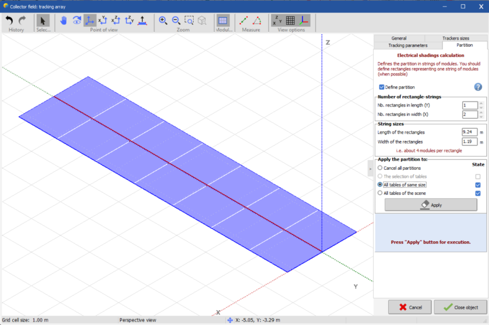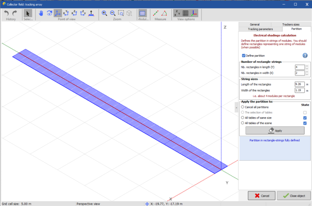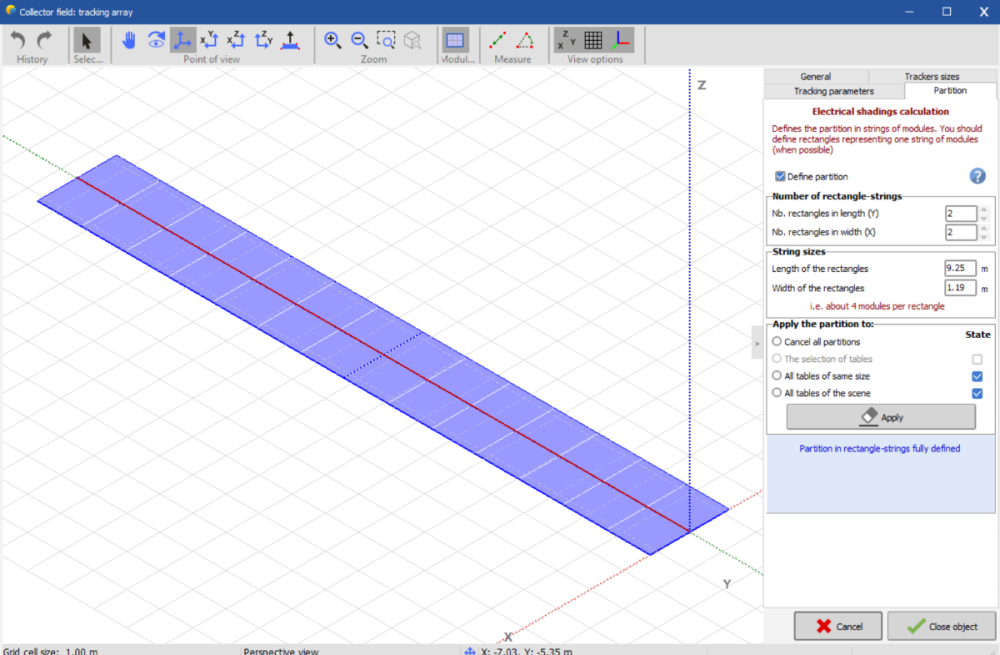 7. Hello! I am simulating a PV plant with strings of 28 modules. Additionally, I am using half-strings (1 x 14) and quarter-strings (1 x 7) in portrait orientation. My question is: Is the partitioning I’ve set up correct? Could you please provide an answer , as i need it badly for my project. and also i want to ask more explanation about 1row portrait and half strings in partitioning for the electrical calculation . -the firs image is for quarter-strings 1p x 7 modules -the second one is for half strings 1p x 14 modules -and the third one is for the complete strings 1 p x 28 modules this is the whole layout