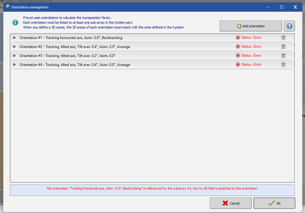 4. I imported a PVC file from VirtoCAD into PVsyst 8.0.9, but during the simulation, I got an error stating that there are two orientations. ''the orientation tracking horizontal axis,azim 00 backtracking is referenced by the subarray 1,but no 3d field is attached to this orientation'' but i didnt add all these orentation that you can see in the photo .... in pvsyst 8.0.9, can anybody resolve this problem?