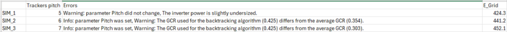 Inspecting the results, we see the error message is returned for  cases where the tracker pitch varies from the tracker pitch in the 3D drawing in Near Shadings