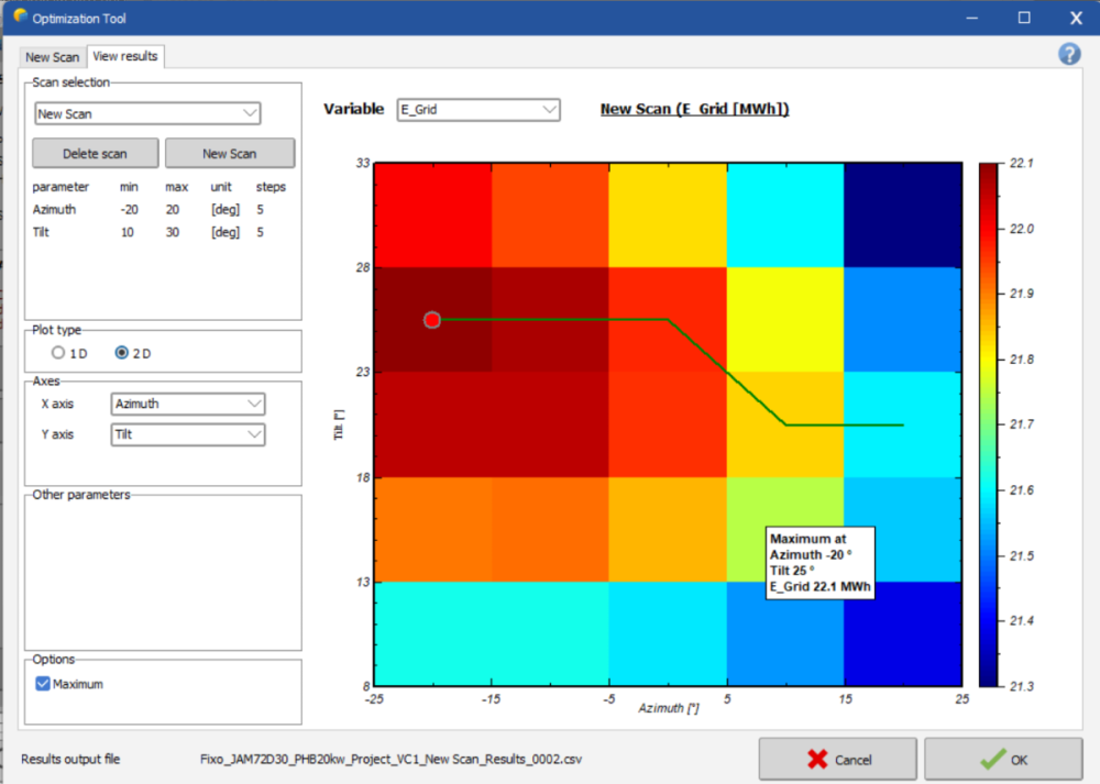 Question: When I set the simulation range for azimuth (e.g., from -20° to +20°), does PVSyst take into account the azimuth specified in the orientation settings? For instance, if the azimuth of the tables is set to 16°, will PVSyst simulate azimuth angles ranging from -4° to +36°?