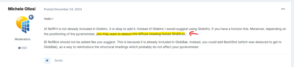 Hello together, I want to analyze the deviation between measured pyranometer data and the simulation output data. The investigated project consists of vertical bifacial PV modules on a agricultural land. On the site there are three pyranometers measuring GHI, front irradiance and back irradiance. To compare the measured irradiance and the PVsyst data I am unsure which simulation variable to use. My current idea: A) Front irradiance = GlobInc + ReflFrt I use GlobInc instead of GlobEff, because the front-pyranometer is not affected the same of the optical losses (shadings, IAM, soiling) like the modules. Question 1: Is that assumption right? Question 2: Is ReflFrt already included into GlobInc? B) Rear irradiance = GlobBak + ReflBck Question 3: Is ReflBck already included into GlobBak? Please answer the three questions and give me general feedback on what to consider for the comparison between measured operating data and simulation output data. Many thanks in advance!