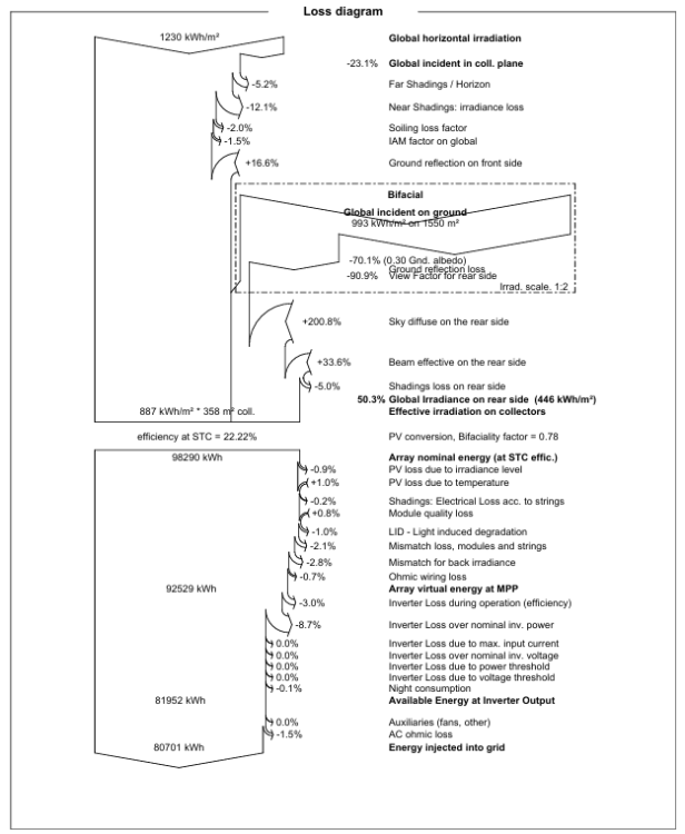 1) Yes, I did enter the albedo in the bifacial model. 2) I attached a picture of the pyranometer placement, it is installed as seen in the first row of the power plant at a height of 3.10m. The power plant has only four rows with a pitch of 8-10m. 3) Attached you can find the loss diagram out of the report. For the front side GlobInc = BeamInc + DiffInc + AlbInc (+ReflFrt), where AlbInc is the reflected irradiance from the far ground. How or where is AlbInc included in the irradiance of the backside, because for vertical solar the calculation for back and front side should be quit similar, compared to modules with a tilt of f.e. 30 degree (there the front and back side irradiance calculation is definitely more different).
