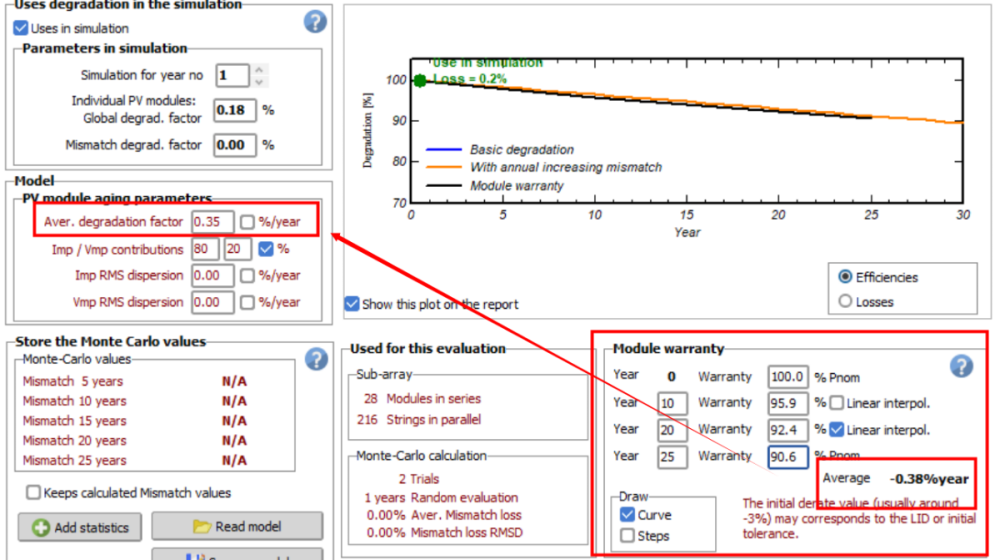 The Average degradation value obtained from the the module warranty interface is 0.38%/ year. Is 0.38% used in the PV module ageing parameters input settings interface?should we change 0.35% to 0.38%?thanks!