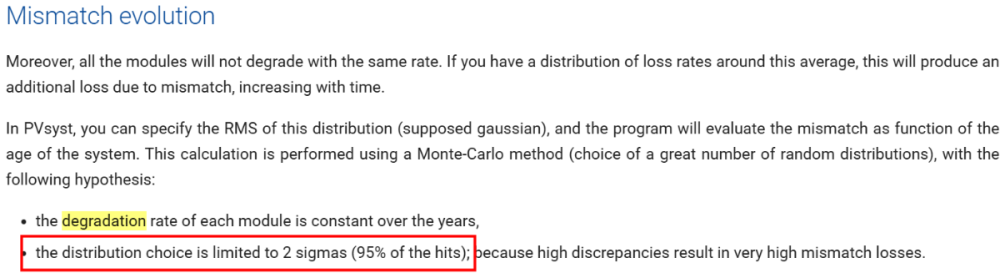 Dear PVsyst team: For the distribution choice is limited to 2 sigmas (95% of the hits) of ageing parameters setting. if there is a clear warranty statement for the annual degradation rate of photovoltaic modules, such as maximum degradation rate 0.35%/ year,maximum 1% for the first year. The slope of the warranty is 0.35%. Can the Im or Vm RMS dispersion be set to 0.35/2 = 0.175 %? thanks!
