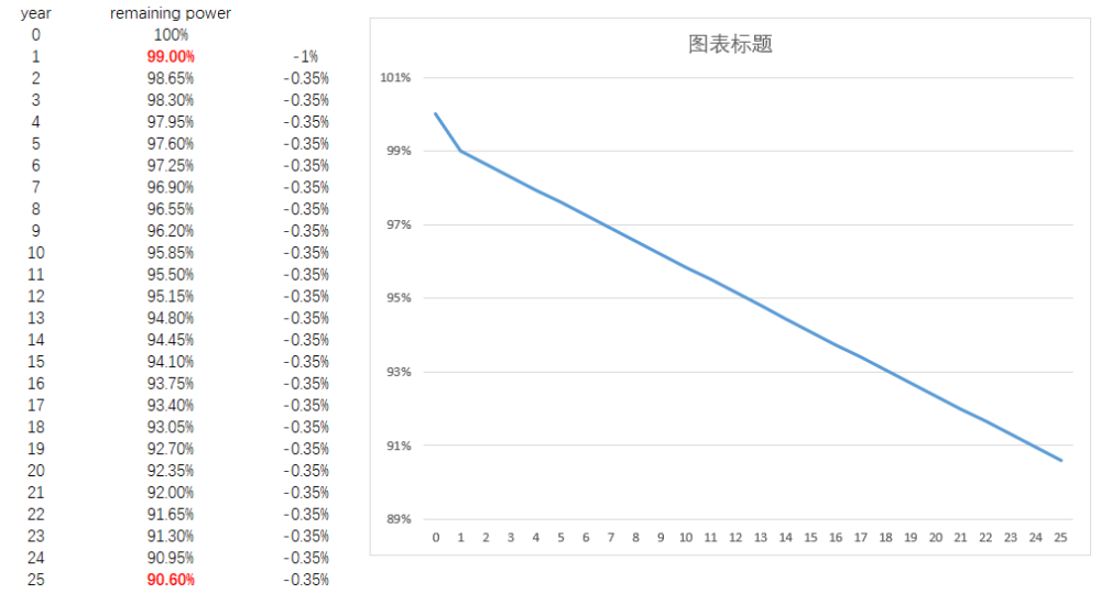 OK,we assume that the degradation given to the user is achievable, that is, in the first year, each solar panel power degradation will not exceed 1%, and starting from the second year, the maximum degradation per year will be 0.35%(the minimum degradation is 0%). According to the upper limit of warranty. "maximum average degradation factor"="1/2 of yearly warranty"="0.175%", right? So at the end of the first year, the minimum power of the module is still 99% of the initial level, and at least 98.65% at the end of the second year, can the average degradation rate from the second year be equal to 0.35%? The worse possible annual degradation rate we assumed in the warranty is 0.35%. "Average degradation factor"+2*"Imp/Vmp RMS dispersion" < "The worse possible annual degradation rate (the upper limit of warranty is 0.35%) " ; so that "Imp/Vmp RMS dispersion"="0.0875%" ,( 0.35% - 0.175%)/2= 0.0875% Thanks for your time!