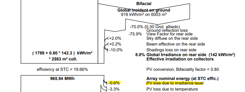 Careful, the 200W/m2 I indicated was not refering to the rear side irradiance. It was a lower irradiance level, irrespective of whether the front or the rear recieves it. I would agree with your calculation only in the case where the front side doesn't recieves any light. Otherwise you cannot decompose the efficiency in two parts from front and rear, it doesn't add up linearly. You need to consider the full I-V curve under the effective irradiance of both front and read sides together. ----- Let's take other numbers to not create confusion again. If in certain scenario, the front side recieves 1000 W/m2 and the rear side e.g. 50W/m2, the module recieves an equivalent of 1000 + f*50 W/m2 of total irradiance. Let's say f=0.8, it is 1040W/m2. If the irradiance level is lower, let's say 5 times lower, the front side recieves 200 W/m2 and the rear side 10 W/m2. Thereforer, under low light, the module recieves an equivalent of 208 W/m2 in total. The curve of performance of the module as function of irradiance should be understood as function of this effective total irradiance. (Indeed, in the norms, when bifacial module are measured, the rear side is masked to not absorbed any light from the rear.) You can visualize this curve in the .PAN file: So whether the light comes from the rear or the front, it is the Incident global light that matters. For this specific curve, if the Incident global Incident global = front-side irradiance + (rear-side irradiance × bifaciality factor) is equal to 200 W/m2, the efficiency will be -3.0% lower than if the Incident global was 1000 W/m2. So any module PV module, bifacial or not, under given illumination condition will operate somewhere on this curve. If the module operates above the reference of 1000 W/m2, you have an efficiency degradation with respect to STC, between 500-1000 W/m2 (for this particular example), you have an efficiency boost, below 500 W/m2 you have an efficiency degradation. It doesn't matter if it is bifacial or not. However, the bifaciality has this influence that the module will operate at a higher illumination level than a monofacial counterpart (in the hypothesis they have exactly the same electrical properties), so at another position on this curve. But as you can see, it could well either mean an improved performance! PVsyst of course take this into account during simulation and you can find it in the loss diagram. For example if you use the "Demo Commercial Oakland" with VC6, you can see it there If for the sake of the test, you modify the .PAN file and set the bificiality factor to 0, you get then: Therefore, for this specific example, on the yearly production you don't see a specific loss difference due to the irradiance level operating further from STC between a bifacial and monofacial module. This is because this effect is small here (I would call it a third order correction). If you had a system with better Albedo for example, the comparison could be different.