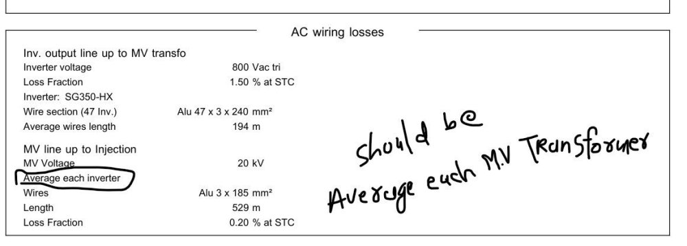 However, the way the data is presented could lead to confusion. Initially, it seems that this distance refers to the wiring between the inverters and the MV transformer. But upon further consideration, it seems that the 760 meters should be the distance from the MV transformer to the injection point (where the power is fed into the grid at 20 kV), not per inverter.