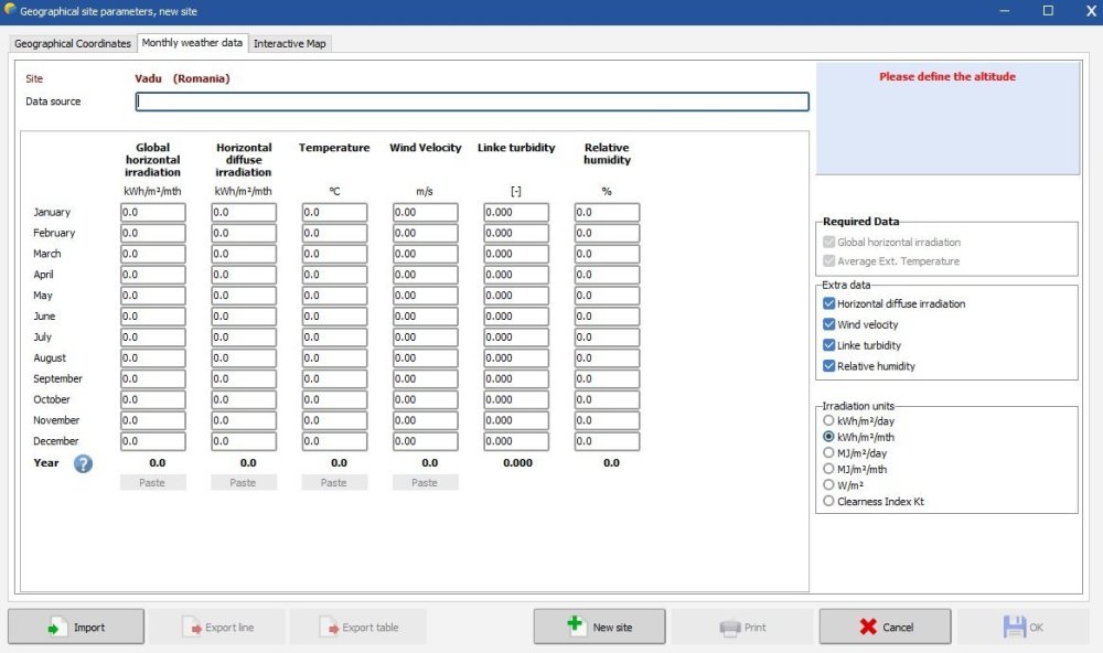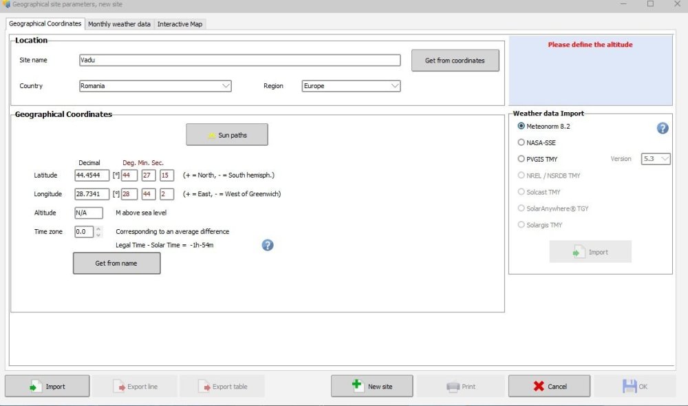 1. Hello, I never had this problem up until 2 weeks ago. I'm trying to create a new site for a project. I click on the new site button, i choose the location on the interactive map, then it switches to the geographical coordinates tab. In the Location panel i need to input manually the site name and country because the get from coordinates button and Get from name button don't work. In the geographical coordinates panel it says that the data have been imported with success from the map but i only imports the latitude and longitude and not also the altitude. The program tells me to define the altitude, i define it but then in changes to N/A again and i cant seem to figure it out. I tried different methods, different site locations but no luck. I'm stuck at the new site window. Is there something wrong from my end with the communication with the servers and can't access the information ? DO i need to reinstall the program or maybe talk with the IT department from my end ?