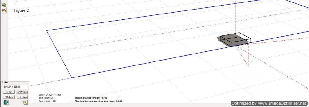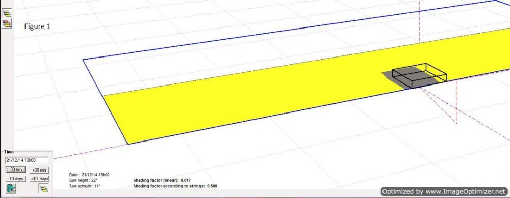 Shading: Linear and Acc. to Module Strings Yield Same ResultDan Nicksy replied to Dan Nicksy's topic in Problems / Bugs Update: I've done some digging and discovered the following two anomalies: 1. At some points throughout the day, the "Shading factor according to strings" is zero even though there is shade cast on a "string" i.e. partition of modules. In Fig1 and Fig2 there are 14 modules in a single shed partitioned into two strings and the shading object is 0.5x0.5x0.1 metres, centred at (0, 0, 0.15 metres). Fig1 shows the simulation performing as expected; Fig2, one half hour timestep later, shows a non-zero linear shading factor and a zero shading factor according to strings. It seems that the shading factor according to strings goes to zero whenever the south-most "string" has shade cast in its middle, but the shade does not touch any edge of the partition. 2. If the bottom of a shading object is higher than the panels (in the Z-direction) then the object may not contribute to the linear shading. Fig3 shows three shading objects; the bottom of the two on the right is higher than the panels. These objects to not cast linear shade on the panels (shown as yellow rather than grey). In Fig4 the same objects have been extended downwards so that the bottom of the objects is below the height of the panels; now they cast shade on the panels. Are these known issues? Has anyone else reported these problems? Note: I'm aware that it is unusual to have shading objects that are a) this close to an array, and b) directly above the array. However, this is a real-world problem I'm facing involving a pre-existing array and a landlord installing some new HVAC equipment, and I'm trying to model it appropriately.