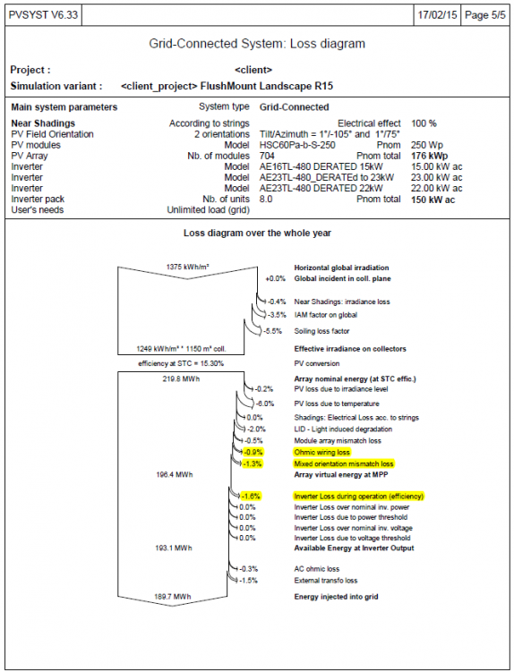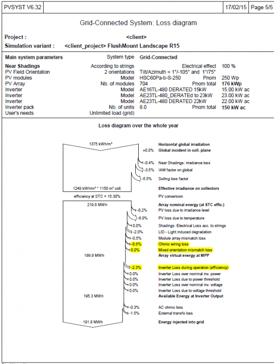 Good afternoon all, Some time ago I created a PVsyst model for a site using PVsyst V6.30. The model uses string inverters, and a number of the string inverters have modules in two different orientations. Where necessary, the Orientation "Mixed #1 and #2" was used in the System parameter definition. The calculated specific production was 1190 kWh/kWp/yr. Recently I re-ran the model using PVsyst V6.33. I used the same files (PAN, OND, SIT, MET) and the same variant, but the calculated production was lower: 1178 kWh/kWp/yr. In order to isolate the problem, I ran the variant in different PVsyst versions. PVsyst V6.30 through V6.32 calculate a specific production of 1190 kWh/kWp/yr, whereas PVsyst V6.33 and V6.34 calculate a specific production of 1178 kWh/kWp/yr. In the Loss Diagram (see attached), the changes from V6.32 to V6.33 are shown: DC ohmic wiring loss increases, mixed orientation mismatch loss increases (from zero), and inverter loss during operation (efficiency) decreases. I reviewed the PVsyst Software Development change-log, and to my understanding nothing there explains this discrepancy. Can anyone help me understand this change between versions? And, most importantly, which version is more accurate? Thanks in advance for any and all help, -Dan