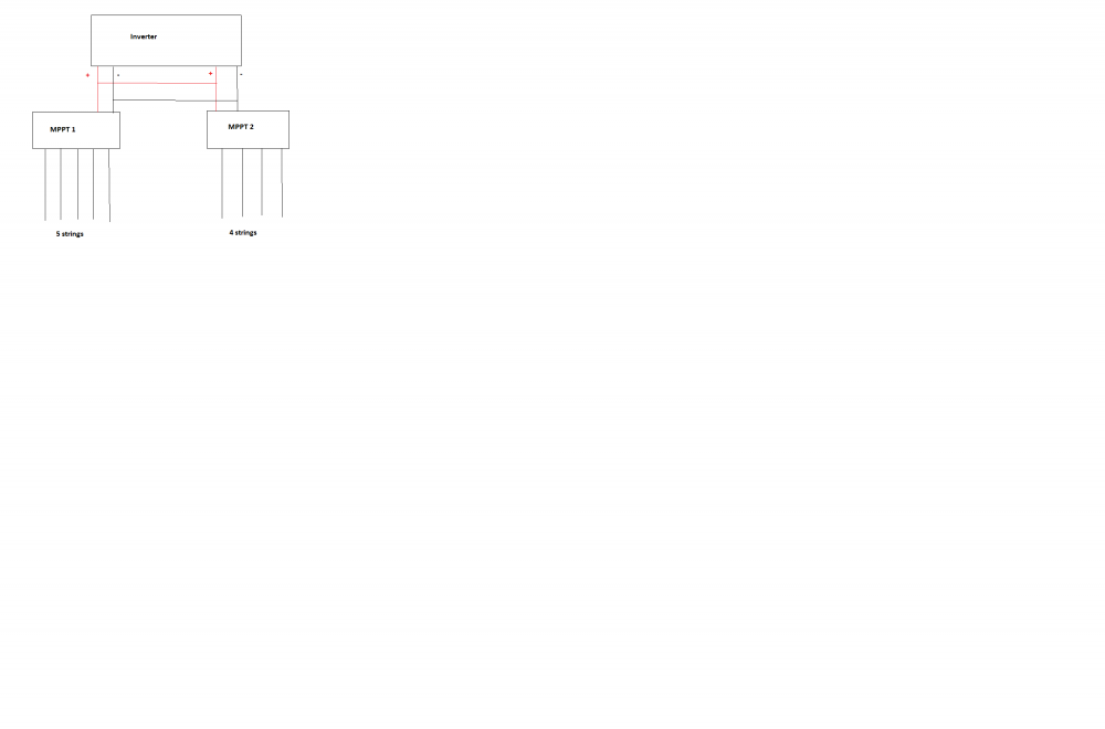 Hello, I like to know in PVsyst how to model an inverter with 2 MPPT. One MPPT has (5) strings and one MPPT has (4) string. And two MPPTs have a shared (not independent) DC side. see attached figure. thanks. Jie inverter - mppt - string connection