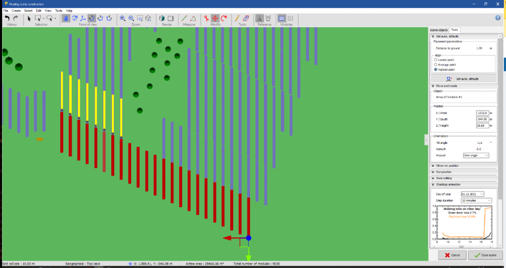 We have a surface that slopes 1.6° to the north. Single-axis trackers with a north-south axis should be installed on this surface. The arrangement of the trackers has a misalign. To map the field we use several tracker arrays. To align the trackers in the correct height we have defined a ground object that gets a tilt of -1.6°. We align the height of the trackers with Set auto. altitude. We now have some trackers in the field that are optically lower than the others, although mathematically the height in the coordinates was calculated correctly by PVSyst. Can someone help here?