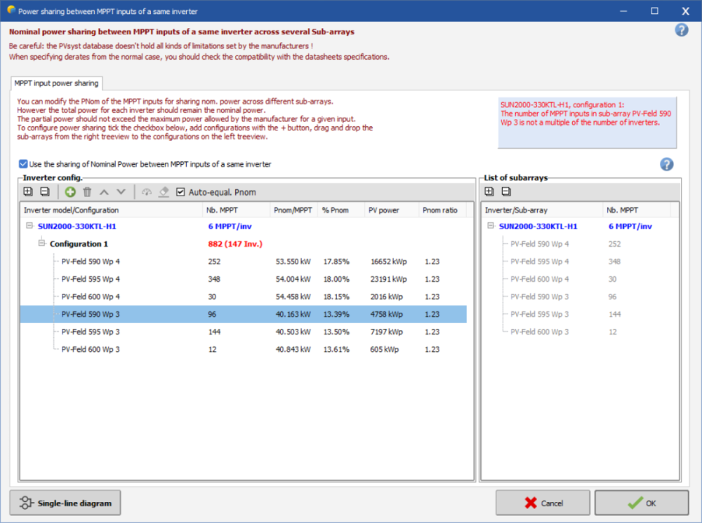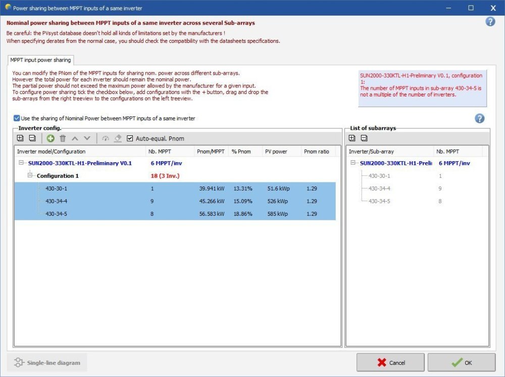 I want to use power sharing between MPPT, because different numbers of strings are connected to the MPPT. I payed attention, that all MPPTs are used. Also I copied the additional configuration fromt the first to get sure, that I always use the same .ond file. Now I get the message, that the number of MPPT inputs is not a multiple of the number of inverters. Who could help? The configuration is: Compatibility between System defintions Full system orientation tilt/azim = 17° / 0° 3 sub-arrays PNom = 1163 kWp, modules area = 5280 m² No shading field defined in the 3D scene ! System parameters 3 sub-arrays defined Sub-array #1 430-30-1 PV modules: 4 strings of 30 modules in series, 120 total Pnom = 430 Wp PNom array = 52 kWp, area = 234 m² Inverters (300 kWac) 1 MPPT inputs, Total 50 kWac, Pnom ratio = 1.03 Sub-array #2 430-34-4 PV modules: 36 strings of 34 modules in series, 1224 total Pnom = 430 Wp PNom array = 526 kWp, area = 2390 m² Inverters (300 kWac) 9 MPPT inputs, Total 450 kWac, Pnom ratio = 1.17 Sub-array #3 430-34-5 PV modules: 40 strings of 34 modules in series, 1360 total Pnom = 430 Wp PNom array = 585 kWp, area = 2656 m² Inverters (300 kWac) 8 MPPT inputs, Total 400 kWac, Pnom ratio = 1.46 3D shadings parameter No shading scene defined