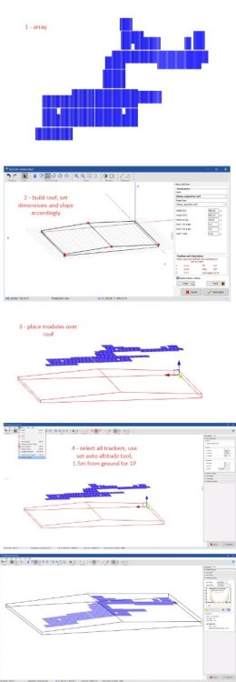The auto altitude function works for fixed tilt systems, but does not adjust the tilt for trackers. There is an automatic tilt function available when creating a zone of trackers, but if the tables are already created, there is no way to adapt their tilt to the terrain, only their elevation. It would be great to add this feature.