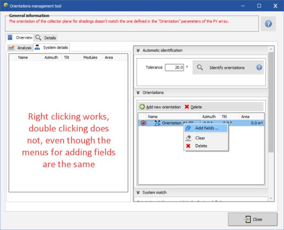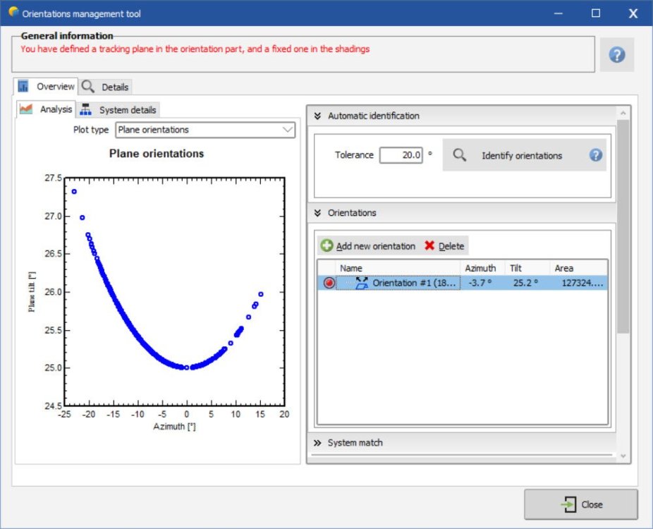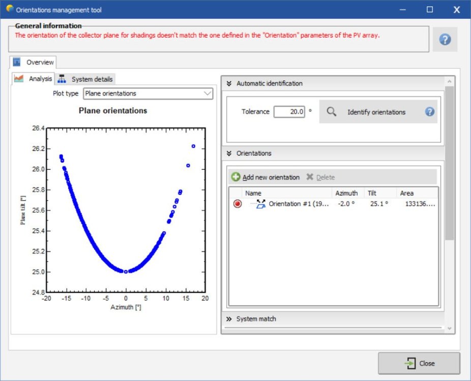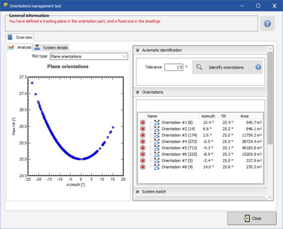 I tested this in 7.3.1 and it worked fine for me. I imported a pvc file I set tolerance to 20, then identified Since I was starting with a tracker variant, i got this message. i went into system, changed to bifacial fixed tilt, then it worked fine. I then imported a different pvc scene for fixed tilt while fixed tilt was already selected under orientation menu (instead of starting from tracker variant). it showed 8 orientations, i changed degree tolerance to 20, then identified new single orientation. this is similar to your message i clicked close anyways with that message and got this message like i showed before then pressed update orientation parameters and it worked fine