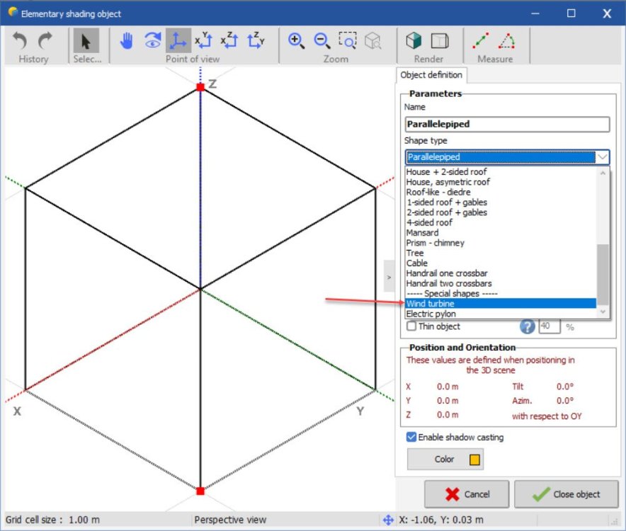 Go to create > elementary shading object. Wind turbines are available, as are other objects. If you need something specific, you can either build it piece by piece or use an approximate shape. -