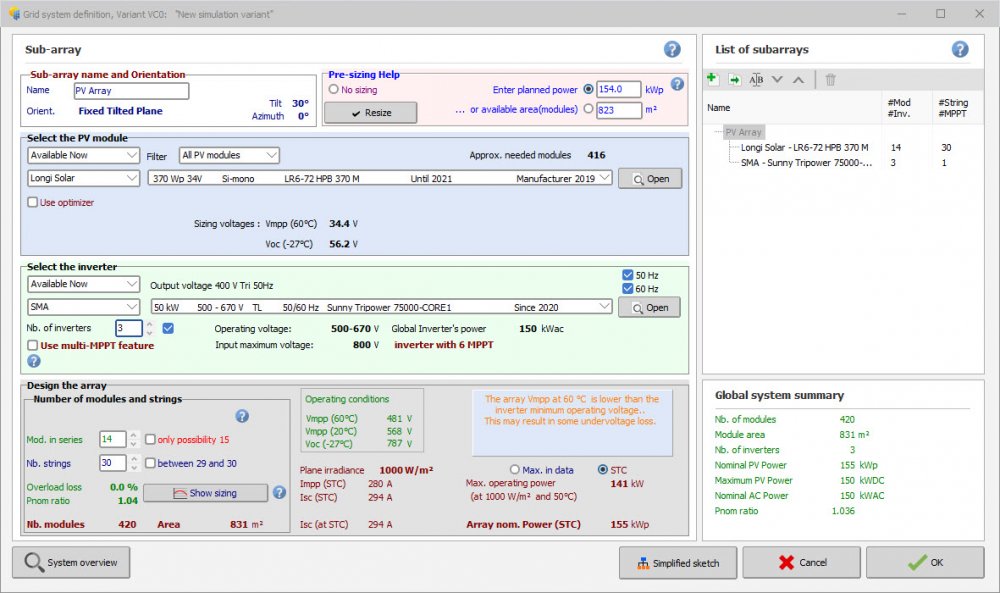 6. Check your PAN file. Your Vmp value does not seem correct, it is too high. For a 1500V system, you should be in the mid to high 20's for string length. You also want a higher DC/AC ratio, 1.2 to 1.3 good range. I suggest getting a new PAN file, or double checking the IV characteristics against the datasheet.