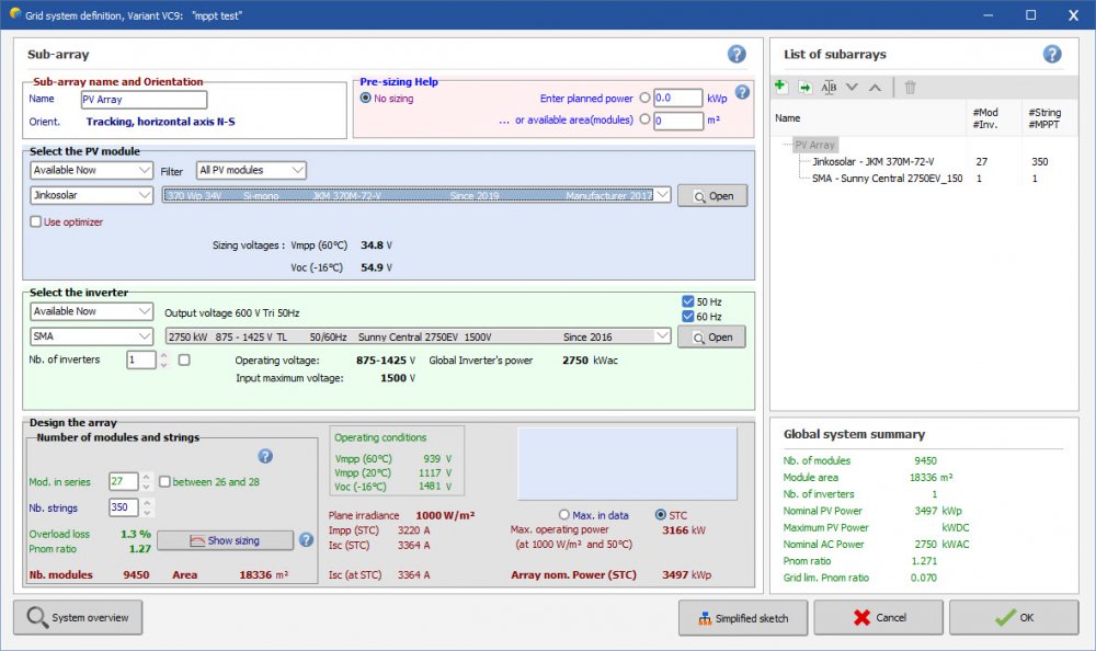 20. Be sure to count the number of MPPT inputs in the system definition, so that it totals to one inverter. If you have 15 mppt inputs on the inverter, you should have 15 utilized in total between the mixed sub-arrays: sub array 1: 8 mppt inputs, N strings of module A sub array 2: 7 mppt inputs, N strings of module B Total mppt inputs: 15 Total inverters: 1