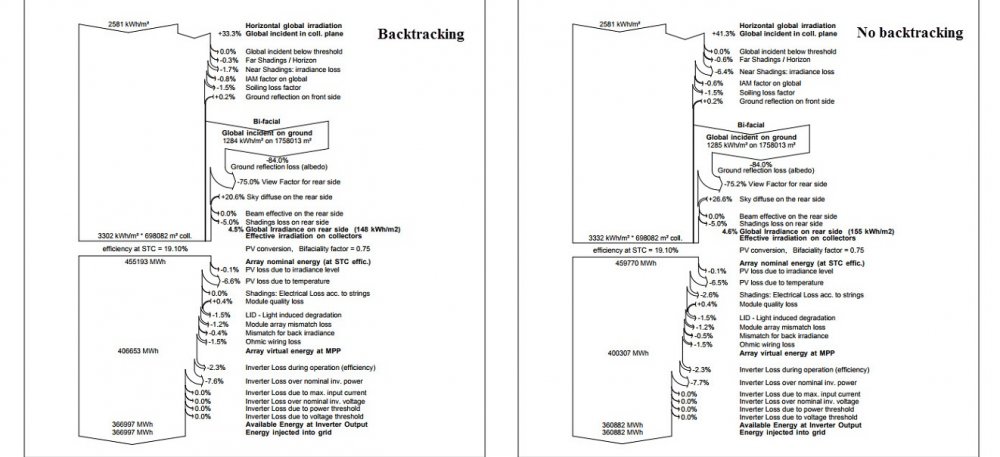 Did you model with the unlimited sheds method in the Orientation menu? The electrical effect loss is not shown in the backtracking version's waterfall. I would double check you have modeled shadings properly for both cases. Even when electrical loss is zero, it still displays in the waterfall in v6.78. Either using the unlimited sheds method, or constructing a shade scene and using the "according to module strings" option (more accurate method). These two statements are in agreement and say the same thing. Backtracking reduces POA and lowers shading losses. The reports confirm this. "Total irradiance received" = global incident in collector plane. Make sure you have properly modeled these with regards to shading. If you have a very low GCR, it is possible your shading losses without backtracking are such that the POA gain is higher than the shading loss incurred. Location may be a factor, you have very high irradiance; might be something unique to your location.