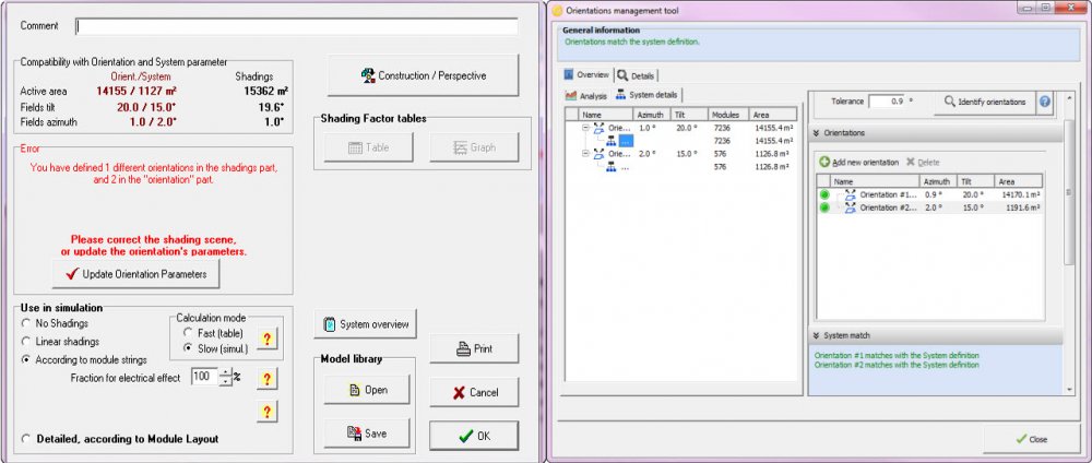Hello, I have defined two orientations in my shade scene. I have set the discriminating orientation difference between shading planes to 0.5 degrees (the lowest it will go). My two orientations are 20/0.9 and 15/2 (tilt/azimuth). When I exit the shade scene however, the model always calculates a single average. In hidden parameters, these values are also set to the lowest possible value, so I dont understand why the program won't discern the two different orientations in the shade scene. I have tried this in 6.7.5 and 6.7.7.