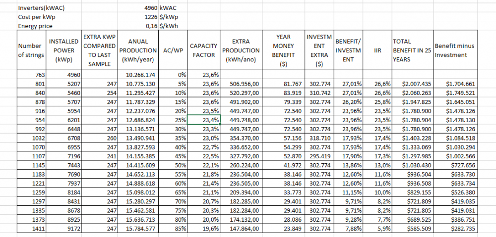 Hello PVsyst forum users, I'm participating at a solar plant project, and I would like to find out an optimal kWAC inverters power/ kWp installed power correlation. For tracking systems, the recommendation is 15% more installed kWp than kWAC. Well, I would like to find a number myself, so I ran some tests using PVsyst and excel. Admitting a fixed 4960 kWAC of inverter power installed, I started the first simulation with 4960 kWp, therefore the relation AC/Wp is 0%, or 100%. Said so, in each new sample I increased 247 Wp approximately over 4960 Wp, that's about 5% more. Great, in my head in some point between 30% and 40% AC/Wp, the extra production generated would drastically decrease, since most of the time the array power would be over the 4960 inverters kWAC, so the extra power would the thrown away. But, that's not what I observed. I assumed that for each extra kWp installed, I would spend 1226 $ more, which means 1226 $/kWp for each extra kWp. And I also assumed, that I will sell this energy to the market for 0,16 $ each kWh, which means, 0,16 $/kWh. So, in some point, the extra investment that I make to install some extra kWp, wouldn't be worth compared to the extra production the array would give me in 25 years, a basic IIR concept. And I've found this point, I just didn't realize this point would be so far from the recommended 15% AC/Wp, of course this is stricted realted to the prices I specified, but those are the prices from where I live converted to dollars. That's the table I generated using Excel. What I'm seeing then, even if I have 80 % AC/Wp, my system will still produce more energy than if I have like 15% AC/Wp, and it's worth the investment since my return in 25 years is higher than the investment. Does it make sense? I hope you guys understand what I'm trying to find here.