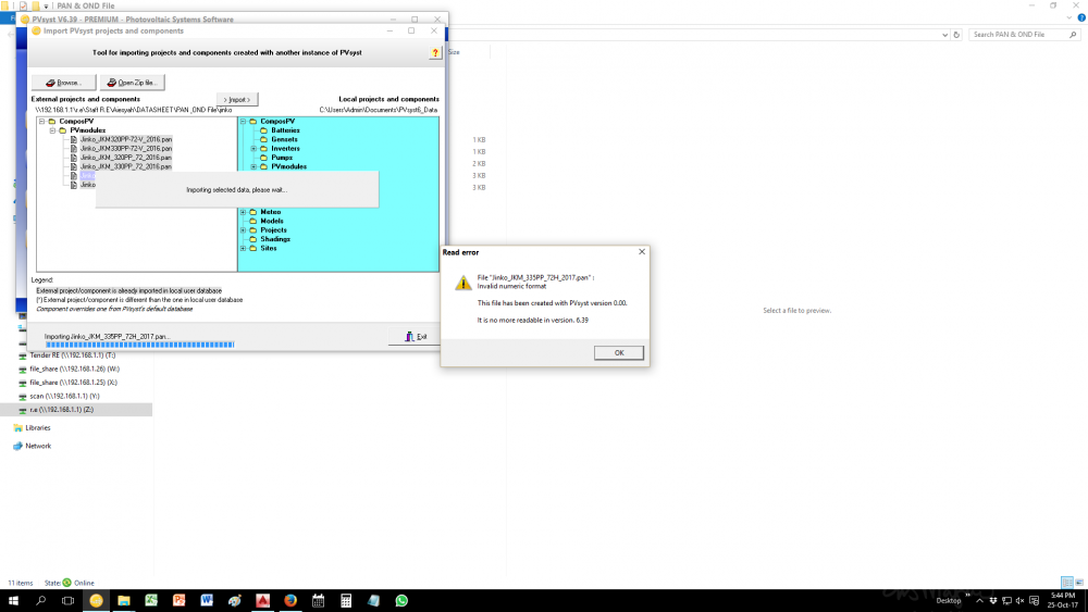 Hi, I have a problem importing .PAN and .OND files from the manufacturer. The error message as per attached file :arrow: . It said that the file created using PVsyst version 0.00. and it is not readable in version 6.39. Please help. TQ Aiesyah