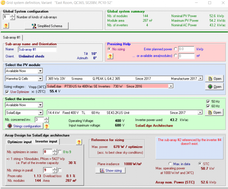 Hello, For reference, I'm using V6.73. While modelling with SolarEdge equipment, I'm finding that in the system definition tab, the array nominal power becomes derated, such that overload losses & production values appear to be inaccurate. Example: screen shot attached - Ex. 144x 365w module = 52.6kWp DC; Inverter = 43.2kW AC; DC/AC ratio = 1.22, yet... - In the Array Design for SolarEdge architecture area, the Pnom ratio shows 1.13 and Overload loss shows 0.1% - Note: 'Reference for sizing' box indicates that there's a Max. power of 678W/optimizer (acc. to best clear sky conditions). The behind the scenes calculation that arrives at the 678 W / optimizer seems to be causing the discrepancy. Equipment spec'd: - Hanwha Q Cells, Q.Peak L-G4.2 365 (2017): 144 pcs. - SolarEdge P730-US: 2 modules in series, 1 module in parallel - SolarEdge 14.4kW inverter; 8 optimizers in series / 9 strings in parallel