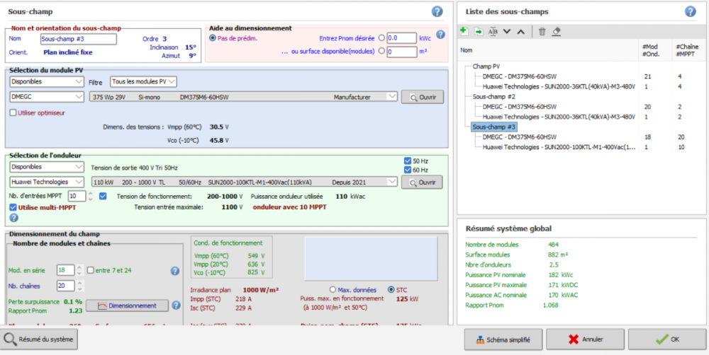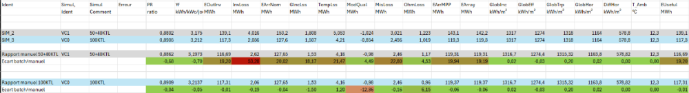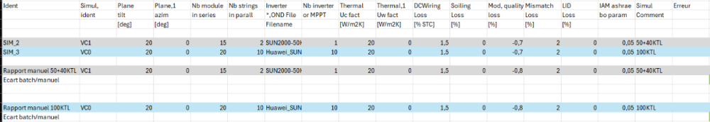 Hi, I'm planning to do a batch simulation to test a setup in different cities. Before that I did a test with a batch of only 2 variants to check the results against a manual simulation for each of the variant. The 2 variants : Same plane, same orientation, same modules, same parameters One variant with a 100KTL One variant with a 50+40KTL 100KTL 50+40KTL The losses in the batch params are the same as the ones in the detailed loss. Do you have an idea about the following things : Why is there a difference between the module quality for the 100KTL variant ? Do batch simulation work with multiple inverters ? Is it normal to have variation between batch simulation and manual simulation ? Thank you